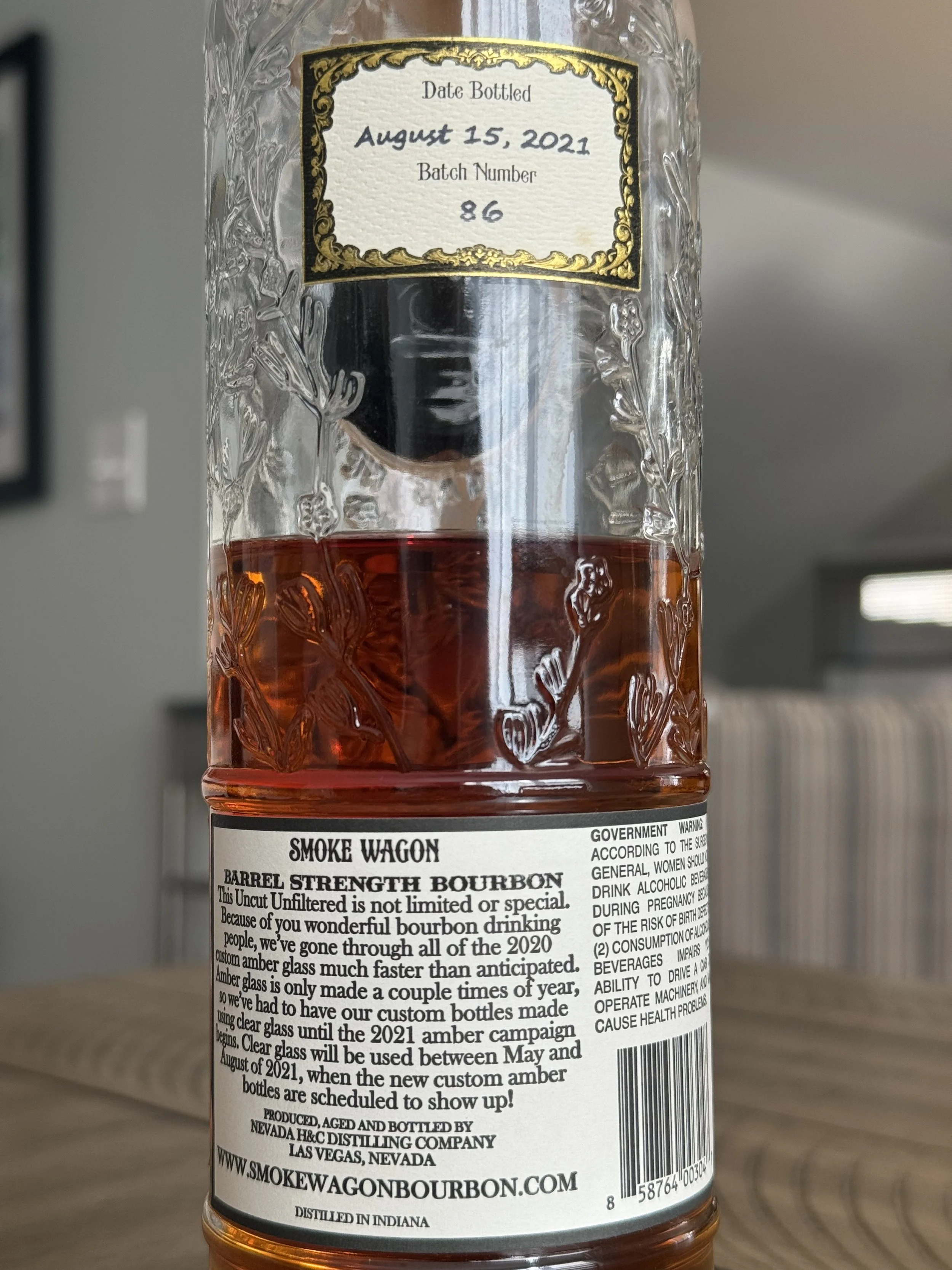Overall: 85. While I didn’t have too much of a write up on this one, this bourbon was a delight. Be aware however, this bourbon was an earlier release by the distillery and was bottled in August of 2021 during a 3 month window where the distillery actually ran out of their classic amber bottles. (You can read a cool note they left on this bottle explaining that issue in the 2nd picture). I had bought this bottle over three years ago and I had forgotten its quality. Smoke Wagon was on a real tear for a while there when it came to consistently producing high quality spirits. I have heard the quality has declined slightly as time has gone on but the Uncut Unfiltered bourbon has still remained true to its form. The nose was solid but overall a letdown compared to the show that the palate and finish had put on. The bourbon really shined in its complexity from the moment it touched your slips to 30-40 seconds after the sip. I would fully recommend this bottle but be warned of its proof! They typically range from 110-120 proof (55% - 60%)